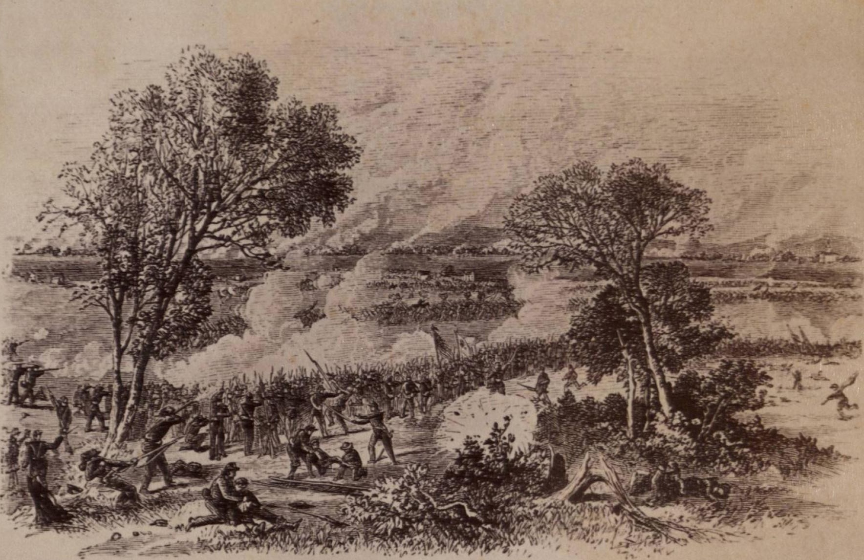 Units of the Union left flank firing into the right flank of the attacking Confederates during Pickett’s Charge on July 3, 1863.