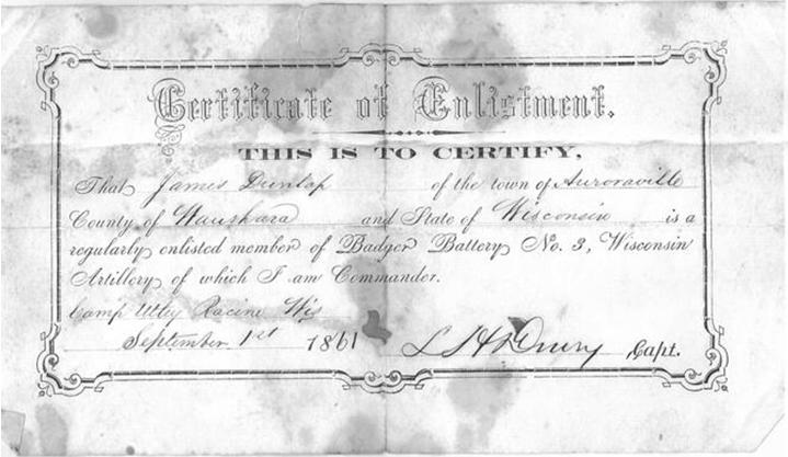 According to his Certificate of Enlistment, James Dunlap enlisted in the “Badger Battery No. 3, Wisconsin Artillery,” at Camp Utley in Racine, Wis., on Sept. 1, 1861 (by Capt. Lucius H. Drury). According to regimental records, however, his enlistment took place on Sept. 2, 1861, at Berlin, Wis. His term of enlistment was for three years. He was mustered in at Camp Utley on Oct. 10, 1861, as a Private, 3rd Independent Battery, Wisconsin Light Artillery.