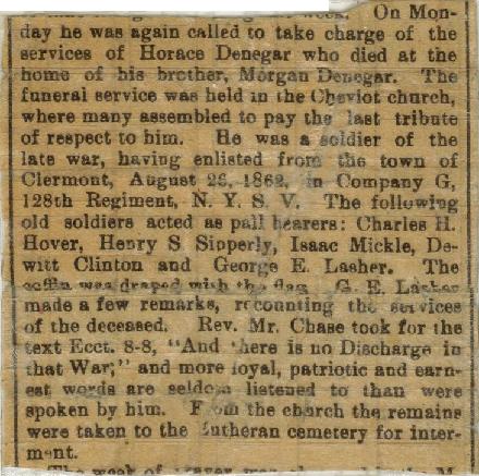 On Monday he was again called to take charge of the services of Horace Denegar who died at the home of his brother, Morgan Denegar. The funeral services were held in the Cheviot church, where many assembled to pay the last tribute of respect to him. He was a soldier of the late war, having enlisted from the town of Clermont, August 26, 1862, in Company G, 128th Regiment, N.Y.S.V. The following old soldiers acted as pall bearers: Charles H. Hover, Henry S. Sipperly, Isaac Mickle, Dewitt Clinton and George E. Lasher. The coffin was draped with the flag. G. E. Lasher made a few remarks, recounting the services of the deceased. Rev. Mr. Chase took for the text Ecct. 8-8, “And there is no Discharge in that war;” and more loyal, patriotic and earnest words are seldom listened to than were spoken by him. From the church the remains were taken to the Lutheran cemetery for interment.